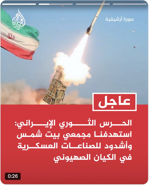 قناة الجزيرة @AJArabic #عاجل| الحرس الثوري الإيراني: استهدفنا قاعدة رامات ديفيد الجوية ووزارة الحرب في منطقة هكريات - استهدفنا مجمعي بيت شمس وأشدود للصناعات العسكرية في الكيان الصهيوني - استهدفنا القاعدة البحرية للجيش الإسرائيلي وحوض بناء السفن الحربية في حيفا - هجماتنا المقبلة ستكون أشد قوة بالاستفادة من تجاربنا السابقة وروح المبادرة https://x.com/AJArabic/status/2027861194212839729 |