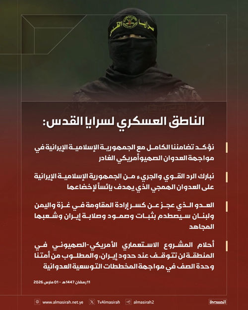 قناة المسيرة @TvAlmasirah 🟥 الناطق العسكري لسرايا القدس: ♦️ نؤكد تضامننا الكامل مع الجمهورية الإسلامية الإيرانية في مواجهة العدوان الصهيوأمريكي الغادر ♦️ نبارك الرد القوي والجريء من الجمهورية الإسلامية الإيرانية على العدوان الهمجي الذي يهدف يائساً لإخضاعها ♦️ العدو الذي عجز عن كسر إرادة المقاومة في غزة واليمن ولبنان سيصطدم بثبات وصمود وصلابة إيران وشعبها المجاهد ♦️ أحلام المشروع الاستعماري الأمريكي-الصهيوني في المنطقة لن تتوقف عند حدود إيران، والمطلوب من أمتنا وحدة الصف في مواجهة المخططات التوسعية العدوانية