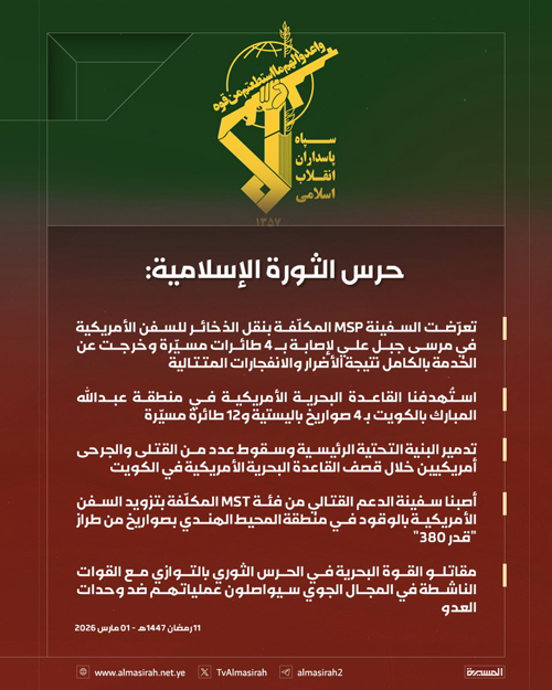 @TvAlmasirah 🟥 حرس الثورة الإسلامية: ♦️ تعرّضت السفينة MSP المكلّفة بنقل الذخائر للسفن الأمريكية في مرسى جبل علي لإصابة بـ 4 طائرات مسيّرة وخرجت عن الخدمة بالكامل نتيجة الأضرار والانفجارات المتتالية ♦️ استُهدفنا القاعدة البحرية الأمريكية في منطقة عبدالله المبارك بالكويت بـ 4 صواريخ باليستية و12 طائرة مسيّرة ♦️ تدمير البنية التحتية الرئيسية وسقوط عدد من القتلى والجرحى أمريكيين خلال قصف القاعدة البحرية الأمريكية في الكويت ♦️ أصبنا سفينة الدعم القتالي من فئة MST المكلّفة بتزويد السفن الأمريكية بالوقود في منطقة المحيط الهندي بصواريخ من طراز "قدر 380" ♦️ مقاتلو القوة البحرية في الحرس الثوري بالتوازي مع القوات الناشطة في المجال الجوي سيواصلون عملياتهم ضد وحدات العدو