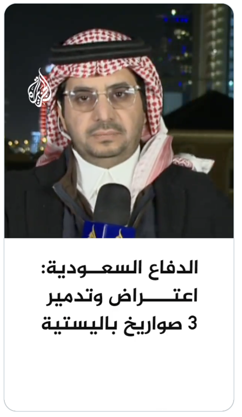 @AJArabic · 14m وزارة الدفاع السعودية: اعتراض وتدمير 3 صواريخ باليستية أطلقت باتجاه قاعدة الأمير سلطان الجوية.. مزيد من التفاصيل مع مراسل الجزيرة بدر الربيعان #الأخبار https://x.com/AJArabic/status/2029719440481259695 |