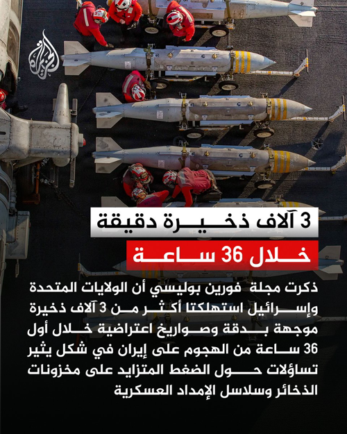 @iraninarabic_ir · 38m مخاوف نفاد الإمدادات الأمريكية في حربها الحالية ضد إيران الجيش الأمريكي قلق من نفاد الإمدادات خلال حربه الحالية مع إيران، ويضطر لاستخدام أسلحة أرخص لتوفير المخزون.