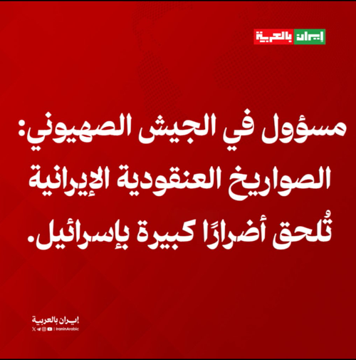 @iraninarabic_ir · 7m القناة 12 التابعة لكيان العدو الصهيوني نقلًا عن مسؤول في الجيش الإسرائيلي: الصواريخ العنقودية الإيرانية تُلحق أضرارًا كبيرة بإسرائيل.