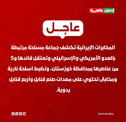 @iraninarabic_ir · 3h المخابرات الإيرانية تكشف جماعة مسلحة مرتبطة بالعدو الأمريكي والإسرائيلي وتعتقل قائدها و5 من عناصرها بمحافظة خوزستان، وتضبط أسلحة نارية ومخابئ تحتوي على معدات صنع قنابل وأربع قنابل يدوية.