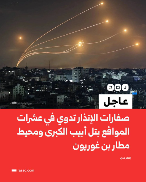 @RassdNewsN · 1h #عاجل| إعلام عبري: صفارات الإنذار تدوي في عشرات المواقع بتل أبيب الكبرى ومحيط مطار بن غوريون