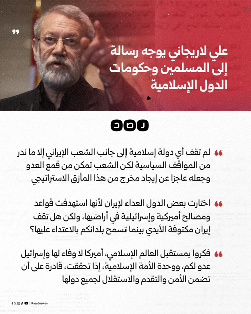 @RassdNewsN · 3h «لم تقف أي دولة إسلامية إلى جانب الشعب الإيراني».. أمين المجلس الأعلى للأمن القومي الإيراني علي لاريجاني يوجه رسالة إلى المسلمين وحكومات الدول الإسلامية، داعيا إلى وحدة الأمة في مواجهة أميركا والاحتلال