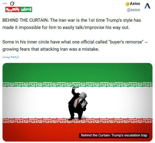 Privacy Policy إ@IranArabic_ir · 1h ذكر موقع أكسيوس أن الحرب مع إيران تمثل المرة الأولى التي يجد فيها الرئيس الأمريكي دونالد ترامب نفسه دون مخرج سهل، حيث لا يستطيع هذه المرة الإفلات من تداعياتها بالاعتماد على أسلوبه المعتاد في الارتجال والتصريحات السريعة. وبحسب التقرير، فإن بعض المقربين من ترامب بدأوا يشعرون بما وصفه أحد المسؤولين بندم المشتري، أي شعور متزايد بالقلق من أن قرار الهجوم على إيران ربما كان خطأً