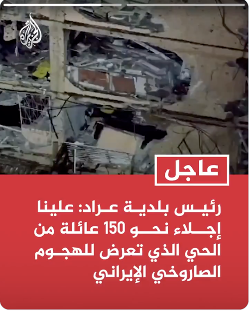 قناة الجزيرة @AJArabic #عاجل | رئيس بلدية عراد: علينا إجلاء نحو 150 عائلة من الحي الذي تعرض للهجوم الصاروخي الإيراني - القصف الإيراني الذي استهدف عراد أوقع أكبر عدد من المصابين منذ بدء الحرب ودمر حيا كاملا https://x.com/AJArabic/status/2035484124895690766 |
