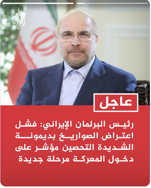 الأحداث الإيرانية @WMX_MEDIA 🔴عـــــــــاجل / محمد باقر قاليباف، رئيس المجلس الإيراني، بعد الضربة الليلة على ديمونا، لقد حان الوقت للمرحلة التالية: اذا فشل النظام الإسرائيلي في اعتراض الصواريخ في منطقة ديمونا شديدة التحصين، فسيكون ذلك علامة تشغيلية على دخول مرحلة جديدة من المعركة: السماء الإسرائيلية بلا دفاع. ونتيجة لذلك، يبدو أن الوقت قد حان لتنفيذ الخطط التالية المخطط لها مسبقًا.