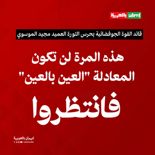 @IranArabic_ir عاجل | قائد القوة الجوفضائية بحرس الثورة العميد مجيد موسوي: - اختبرتمونا قبلاً ورأى العالم أنكم بدأتم تلعبون بالنار بمهاجمة البنى التحتية - هذه المرة لن تكون المعادلة "العين بالعين".. فانتظروا - على العاملين في الشركات الصناعية المرتبطة بالأميركيين والكيان الصهيوني مغادرة أماكن عملهم فوراً لحفظ حياتهم