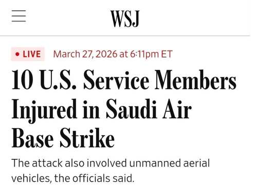 إيران بالعربية @iraninarabic_ir وول ستريت جورنال عن مسؤولين: إصابة 10 عسكريين أمريكيين بينهم اثنان بجروح خطيرة في هجوم على قاعدة الأمير سلطان الجوية بالسعودية.