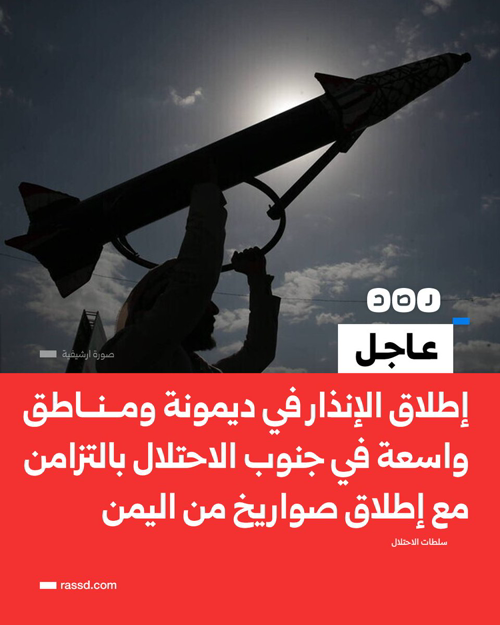 @RassdNewsN · 47m #عاجل| إطلاق صافرات الإنذار في ديمونة ومــنــاطق واسعة في جنوب الاحتلال بالتزامن مع إطلاق صواريخ من اليمن، وسماع دوي انفجارات (إعلام عبري)