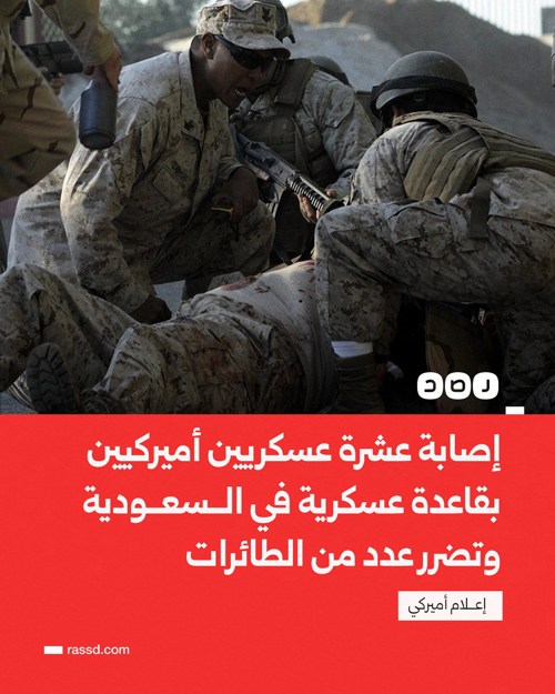 @RassdNewsN · 5h تغطية صحفية| إصابة عشرة عسكريين أميركيين في قاعدة عسكرية بالسعودية منهم اثنين في حالة خطرة وتضرر عدد من الطائرات الأميركية بعد وصول صاروخ إيراني لهدفه بنجاح، حسب مصادر لصحيفة وول ستريت جورنال