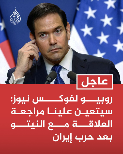 @huthaifaabdulah · 28m هدد ترامب بتفكيك حلف الناتو صراحة وها هو روبيو يؤكد بصيغة دبلوماسية قناة الجزيرة @AJArabic · 1h #عاجل | روبيو لفوكس نيوز: سيتعين علينا مراجعة العلاقة مع النيتو بعد حرب إيران