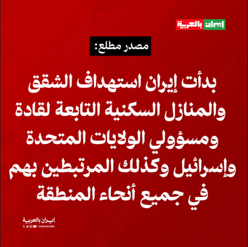 @iraninarabic_ir · 4h 🟥 مصدر مطلع: بدأت إيران استهداف الشقق والمنازل السكنية التابعة لقادة ومسؤولي الولايات المتحدة وإسرائيل، وكذلك المرتبطين بهم، "في جميع أنحاء المنطقة".