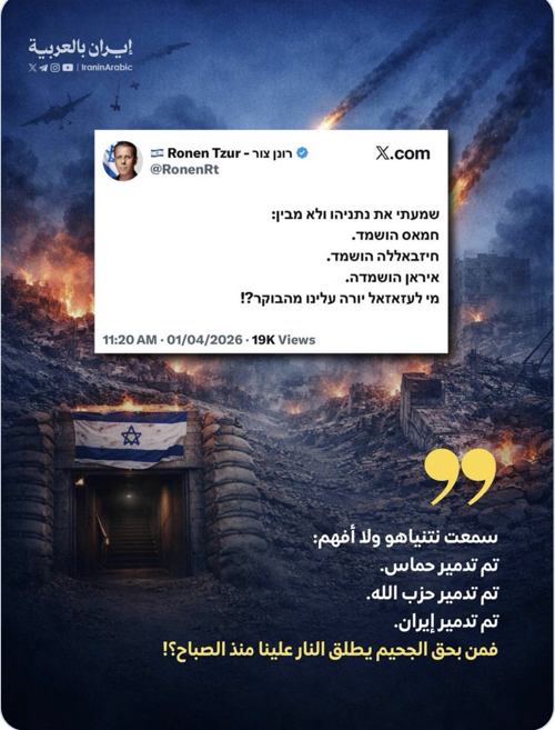 @iraninarabic_ir · 2h مستوطن صهيوني ….سمعت نتنياهو ولا أفهم : تم تدمير حماس. تم تدمير حزب الله. تم تدمير إيران. فمن بحق الجحيم يطلق النار علينا منذ الصباح؟!