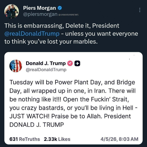 @v_alalamnews · 2h 🔴رد فعل مقدم بريطاني مشهور على تهديد ترامب للبنية التحتية الإيرانية: احذف هذا المنشور! إلا إذا كنت تريد أن يعتقدوا أنك فقدت عقلك 🔹كتب بييرز مورغان، مقدم البرامج والصحفي البريطاني الشهير: هذا أمر مخزي، احذفه أيها الرئيس ترامب؛ إلا إذا كنت تريد أن يعتقد الجميع أنك فقدت عقلك.
