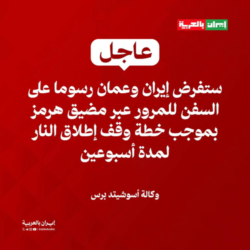 @iraninarabic_ir · 3h وكالة أسوشيتد برس: ستفرض إيران وعمان رسومًا على السفن للمرور عبر مضيق هرمز بموجب خطة وقف إطلاق النار لمدة أسبوعين. ستستخدم إيران الأموال لإعادة الإعمار، بينما خطط عمان غير واضحة.