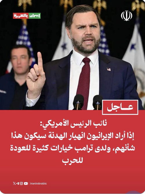 @IranArabic_ir · 1h نائب الرئيس الأمريكي: - إذا أراد الإيرانيون انهيار الهدنة سيكون هذا شأنهم، ولدى ترامب خيارات كثيرة للعودة للحرب - "إسرائيل" وافقت على ضبط النفس في لبنان، وتهيئة الظروف لنجاحنا في المفاوضات بشأن إيران - إيران ستواجه عواقب وخيمة إذا لم تفتح مضيق هرمز