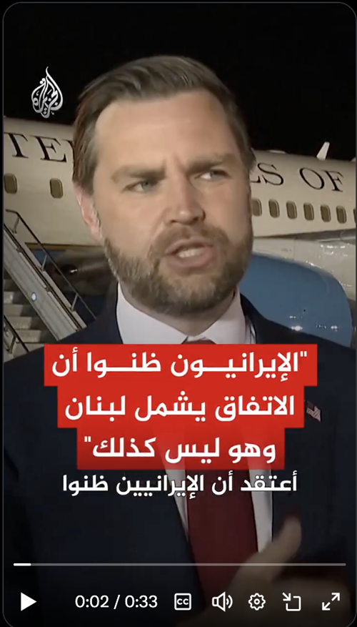 قناة الجزيرة @AJArabic نائب الرئيس الأمريكي جي دي فانس يقول إن الإيرانيين ظنوا أن اتفاق وقف إطلاق النار يشمل لبنان وهو ليس كذلك، مضيفا أن الإسرائيليين عرضوا ضبط النفس في لبنان. #فيديو https://x.com/AJArabic/status/2042030935902707933 |
