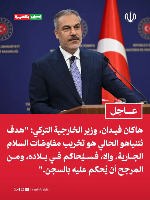Privacy Policy إ@iraninarabic_ir Terms of Service & Privacy Policy · 5h هاكان فيدان، زير الخارجية التركي: "هدف نتنياهو الحالي هو تخريب مفاوضات السلام الجارية. وإلا، فسيُحاكم في بلاده، ومن المرجح أن يُحكم عليه بالسجن."