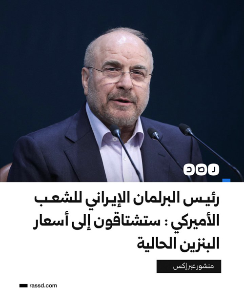 Privacy Policy ش@RassdNewsN Terms of Service & Privacy Policy · 55m رئيس ا لرلمان الإيراني قاليباف يوجه رسالة للشعب الأميركي في منشور عبر "إكس": ستشتاقون إلى أسعار البنزين الحالية Image