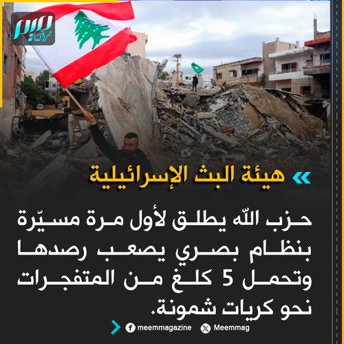 @Meemmag · 6h هيئة البث الإسرائيلية: حزب الله يطلق لأول مرة مسيّرة بنظام بصري يصعب رصدها وتحمل 5 كلغ من المتفجرات نحو كريات شمونة.