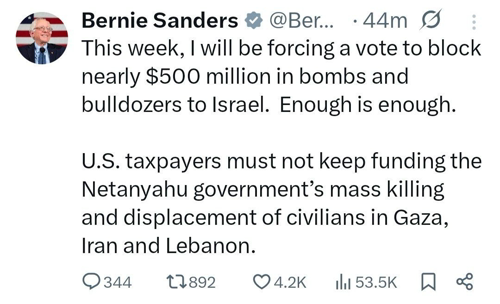 @v_alalamnews · 2h ⭕️السيناتور الأمريكي بيرني ساندرز : سأُجري هذا الأسبوع تصويتاً لمنع وصول قنابل وجرافات إلى"إسرائيل"بقيمة 500مليون دولار لقد طفح الكيل يجب ألا يستمر دافعو الضرائب الأمريكيون في تمويل عمليات القتل الجماعي وتشريد المدنيين التي ترتكبهاحكومة نتنياهو في غزة وإيران ولبنان