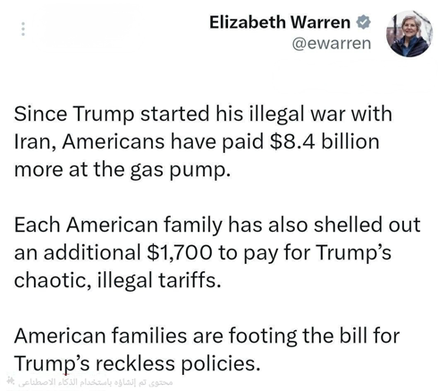 @v_alalamnews · 10h ✅السيناتورة الاميركية «إليزابيث وارن»: 🔹منذ أن بدأ ترامب حربه غير القانونية مع إيران دفع الأمريكيون 8.4 مليارات دولار إضافية في محطات الوقود. 🔹كما أن كل أسرة أمريكية دفعت 1700 دولار إضافية 🔹الأسر الأمريكية تدفع ثمن سياسات ترامب المتهورة.