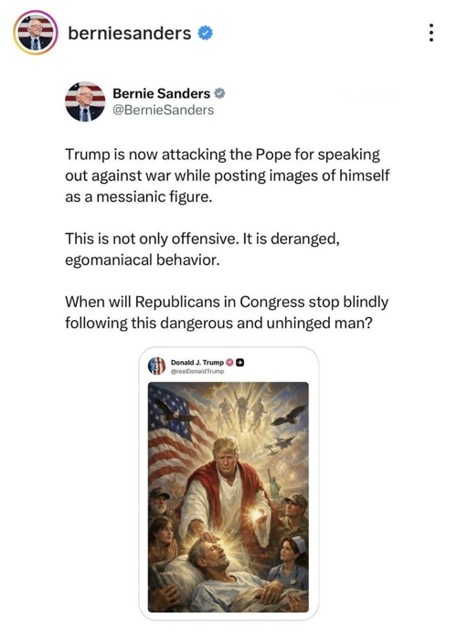 @v_alalamnews · 11h السيناتور الديمقراطي الأمريكي بيرني ساندرز:إلى متى سيواصل الجمهوريون اتباع ترامب المجنون والخطير بشكل أعمى؟: 🔺 ترامب يهاجم الآن البابا بسبب حديثه ضد الحرب وفي الوقت نفسه نشر صورة لنفسه باعتباره مخلّصًا مسيحيا 🔺هذا التصرف ليس مسيئًا فحسب بل يعكس نرجسية مفرطة واضطرابًا نفسيا