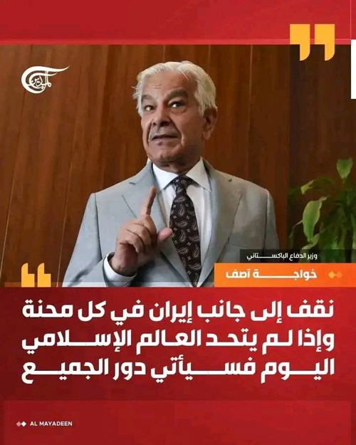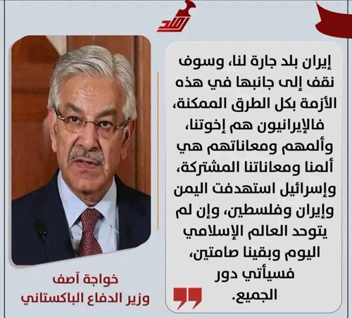 @sarahArdogn · 6h المسلمون إخوة✌🏻🇵🇰🇮🇷🇹🇷🇸🇦 وزير الدفاع الباكستاني: نقف إلى جانب إيران بكل الوسائل الممكنة والإيرانيون إخوتنا وسنحمي مصالحهم وحذر "إسرائيل تستهدف اليمن وإيران وفلسطين-لذا فإن وحدة العالم الإسلامي أصبحت ضرورة حتمية اذا بقينا صامتين ومنقسمين اليوم فسيتم استهداف الجميع في النهاية".