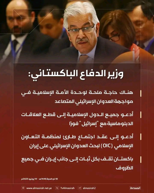 @sana_hanu · 2h 🟥 وزير الدفاع الباكستاني: ♦️ هناك حاجة ملحة لوحدة الأمة الإسلامية في مواجهة العدوان الإسرائيلي المتصاعد ♦️ أدعو جميع الدول الإسلامية إلى قطع العلاقات الدبلوماسية مع "إسرائيل" فورًا ♦️ أدعو إلى عقد اجتماع طارئ لمنظمة التعاون الإسلامي (OIC) لبحث العدوان الإسرائيلي على #إيران