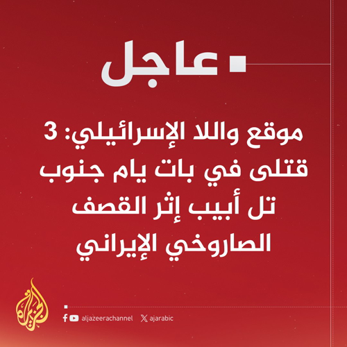 @g4_p6 · 46m 🚨 #عاجل | مواقع إسرائيلية: شهود عيان يقولون إن صاروخا إيرانيا وقع في موقع استراتيجي وسط إسرائيل #إيران #إسرائيل #تل_أبيب عاجل || الحرب || News @g4_p6 · 46m 🚨 #عاجل | الإسعاف الإسرائيلي: إصابة 4 إسرائيليين جراء سقوط صاروخ في تل أبيب #فلسطين #إيران #إسرائيل #تل_أبيب عاجل || الحرب || News @g4_p6 · 49m 🚨 #عاجل | وسائل إعلام إسرائيلية: أضرار كبيرة نتيجة سقوط صاروخ إيراني في تل أبيب #فلسطين #غزة #تل_أبيب #إيران |