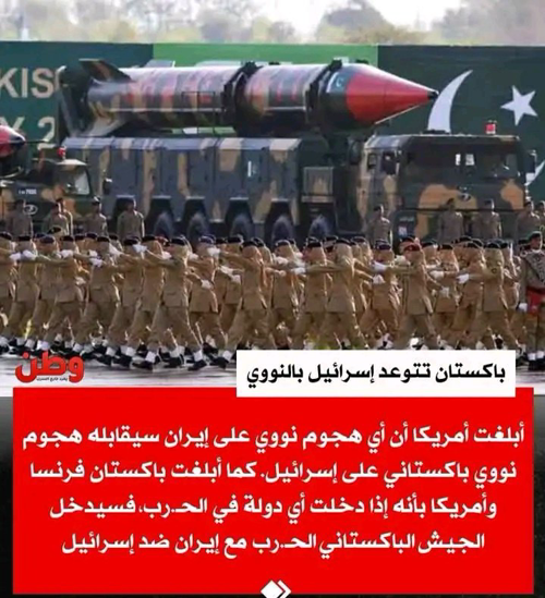 @g4_p6 · 5h 🚨 #عاجل | القناة العاشرة العبرية : باكستان أبلغت امريكا بأن اي هجوم نووي على #إيران سيقابله هجوم نووي باكستاني على اسرائيل. باكستان أبلغت فرنسا وأمريكا بأنه في حال تدخل أي دولة في الحرب بشكل مباشر على إيران مع اسرائيل سيدخل الجيش الباكستاني الحرب مع ايران ضد اسرائيل #باكستان |