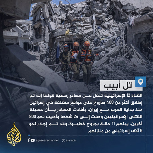 قناة الجزيرة @AJArabic · 2h أكثر من 400 صاروخ إيراني أُطلق على إسرائيل منذ بدء الحرب وحصيلة القتلى الإسرائيليين وصلت إلى 24 شخصا