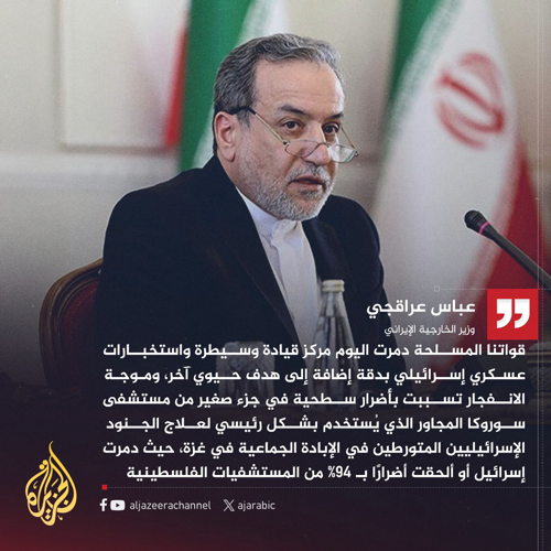 @ajmubasher · 18m هيئة البث الإسرائيلية: إجلاء 700 شخص من سكان حولون في تل أبيب والاستعداد لهدم 5 مبان لم تعد صالحة للسكن جراء القصف الإيراني #الجزيرة_مباشر