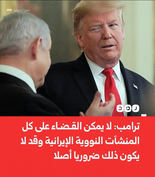@al_airani · 15m ترامب: لا يمكن القضاء على كل المنشآت النووية الإيرانية وقد لا يكون ذلك ضروريا أصلا