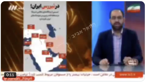 @al_airani · 58m التلفزيون الإيراني لترامب: "أنت من بدأ، ونحن من سيُنهي". في الخلفية، تُعرض جميع القواعد العسكرية الأمريكية في الشرق الأوسط كأهداف إيرانية للهجوم. https://x.com/al_airani/status/1936599559431487570 |