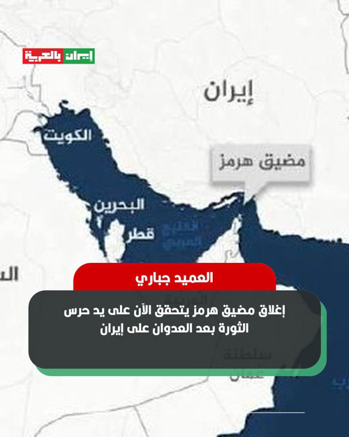 @iraninarabic_ir · 2h القيادي في حرس الثورة العميد إبراهيم جباري: إغلاق مضيق هرمز يتحقق الآن على يد حرس الثورة بعد العدوان على إيران