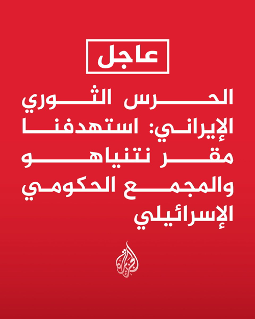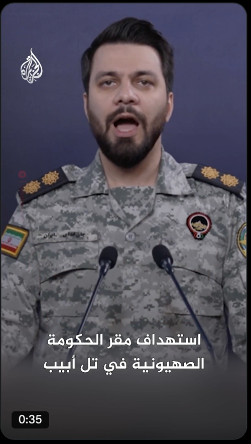قناة الجزيرة @AJArabic · 1h "صفارات الإنذار في إسرائيل لن تتوقف أبدا".. قال المتحدث باسم مقر خاتم الأنبياء التابع للحرس الثوري الإيراني إبراهيم ذو الفقاري اليوم الاثنين، إن الموجة العاشرة من عمليات "الوعد الصادق 4" استهدفت مقر الحكومة الإسرائيلية في تل أبيب ومراكز عسكرية في حيفا. #فيديو https://x.com/AJArabic/status/2028443930035994991 |