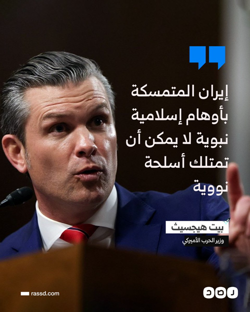 @RassdNewsN · 17m وزير الحرب الأميركي: لا يمكن لأنظمة مجنونة مثل إيران المتمسكة بأوهام إسلامية نبوية أن تمتلك أسلحة نووية