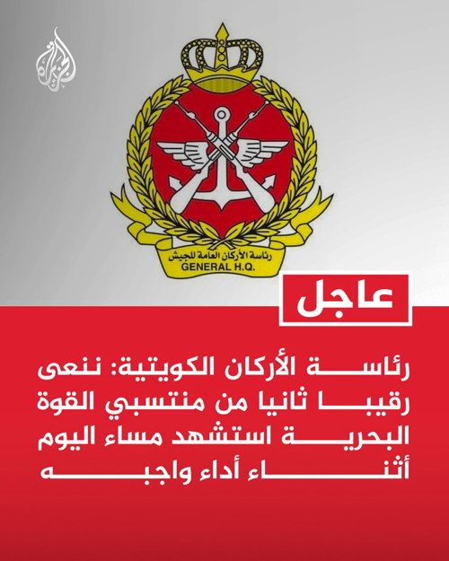 @AJArabic #عاجل | رئاسة الأركان الكويتية: ننعى رقيبا ثانيا من منتسبي القوة البحرية استشهد مساء اليوم أثناء أداء واجبه سدوسي @sdwsy59583 · 22m مع نتنياهو وترمب ههههههه عبدالله ابوالرجال Abdulla Abualrejal @Abdulla39891654 · 7m قتلوهم الأذناب الأنذال صفوهم لأنهم غاروا على عرضهم ووطنهم فاسقطوا الطائرات الأمريكية Sofiane BenHadjSlama @TunisiawithGaza · 4m "استشهد"! Carthaginian 🏛️ @rebelbil1 · 7m أخرجوا الصهاينة من اراضيكم قبل فوات الأوان عبده الجبري @abdohhnbey · 11m صريع في سبيل ترامب