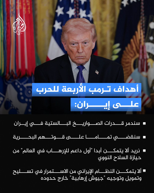 @AJArabic · 34m أعلن الرئيس الأمريكي قائمة من أربعة أهداف للحرب على إيران في تصريح أدلى به في البيت الأبيض.