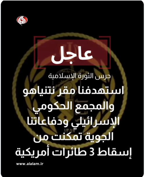 @v_alalamnews حرس الثورة الإسلامية: استهدفنا مقر نتنياهو والمجمع الحكومي الاسرائيلي ودفاعاتنا الجوية تمكنت من إسقاط 3 طائرات أمريكية #إنتصار_ايران https://x.com/v_alalamnews/status/2028468369540677902 |