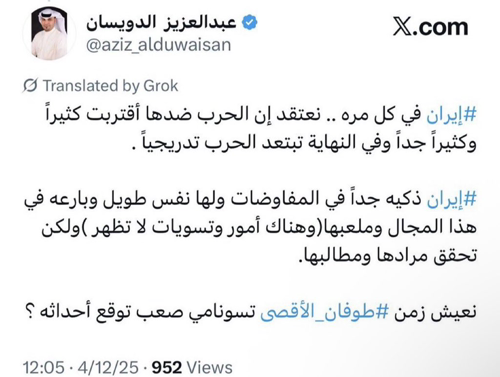 @aziz_alduwaisan · Feb 27 Replying to @halgawi السيناتور الأمريكي ليندسي غراهام عن الموقف الأمريكي من إيران: " هذه حرب دينية ستحدد مستقبل الشرق الأوسط لألف عام " . دون تهويل وتخويف .. ولكن الواقع يقول العالم يعيش مرحلة ( كسر عظم ) مرحلة تشهد تبدل وتغير كبير وعظيم .