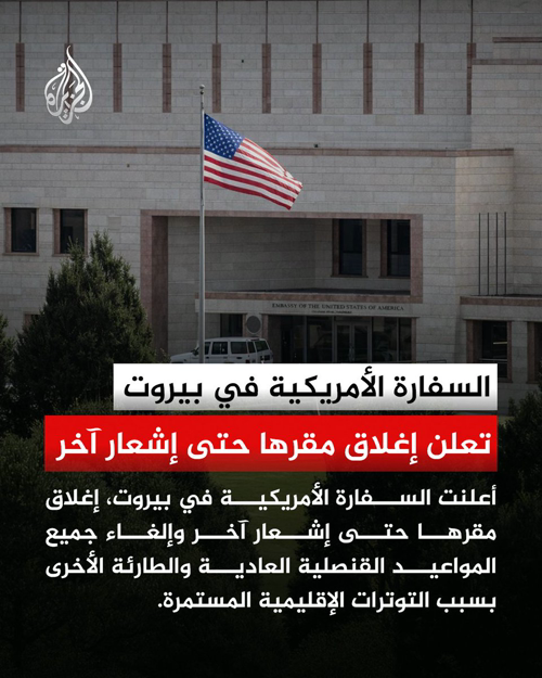 @AJArabic · 7m عزت قرارها إلى التوترات الإقليمية المستمرة.. السفارة الأمريكية في بيروت، تعلن إغلاق مقرها حتى إشعار آخر وتلغي جميع المواعيد القنصلية العادية والطارئة