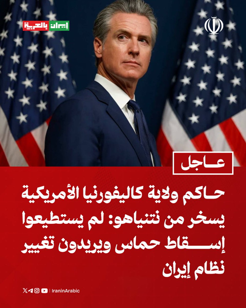 @iraninarabic_ir · 3m حاكم ولاية كاليفورنيا الأمريكية يسخر من نتنياهو: لم يستطيعوا إسقاط حماس ويريدون تغيير نظام إيران.