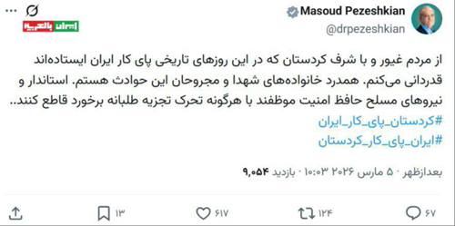 @iraninarabic_ir · 6m الرئيس مسعود بزشكيان: أعرب عن تقديري لأبناء كردستان الغيارى والشرفاء الذين وقفوا إلى جانب إيران في هذه الأيام التاريخية القوات المسلحة مسؤولة عن حفظ الأمن وملزمة بالتعامل بحزم مع أي تحرك انفصالي وكردستان سند لإيران وإيران سند لكردستان