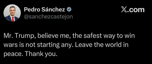 @v_alalamnews · 7h 🔴 بيدرو سانشيز، رئيس وزراء إسبانيا: السيد ترامب، صدّقني، إنّ الطريقة الأكثر أمانًا لتحقيق النصر في الحروب هي ألّا تبدأ أي حرب من الأساس. دع العالم يبقى في سلام. شكرًا لك.