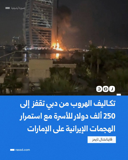 @RassdNewsN تكاليف الهروب من دبي تقفز إلى 250 ألف دولار لأسرة مكوّنة من 4 أفراد عند اللجوء إلى الطائرات الخاصة، في ظل استمرار الاستهدافات الإيرانية على الإمارات، وفقا لصحيفة «فاينانشال تايمز». وبحسب التقرير، تضاعفت أسعار الطائرات المستأجرة منذ نهاية الأسبوع، بالتزامن مع استمرار تعليق الخدمات المنتظمة، فيما ارتفعت أجور الانتقال برا من دبي إلى مسقط أو الرياض إلى آلاف الدولارات بعد أن كانت لا تتجاوز مئات قليلة.