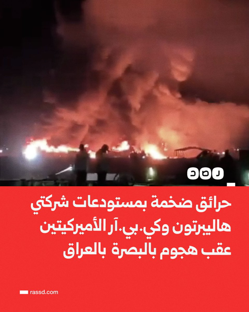 @RassdNewsN · 1h تغطية صحفية| حرائق ضخمة بمستودعات شركتي هاليبرتون وكي.بي.آر الأميركيتين عقب هجوم في البصرة بالعراق
